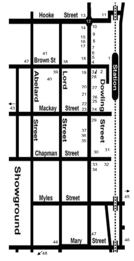 Throught the 1800s, it seems that there was relatively little building west of Lord St. The main populated area was on Dowling St and within a block either way on its various cross streets (Hooke, Brown, Mackay, Chapman, Myles, and Mary). One John Wilson, born in Dungog in 1854, is said to have described the town as a “sea of bush and scrub, with a house here and there”, and with bullock teams and drays having “to wend their way between stumps and saplings”.