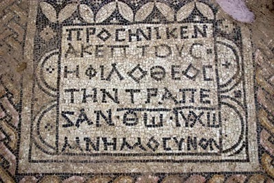 There are Christian inscriptions in church spaces that have been excavated, increasing in numbers over the centuries. The Akeptous Inscription is one of a number of inscriptions found in the mosaic floor of a 3rd century church. It was discovered in 2005 while digging inside the Megiddo Prison in Israel. There are six lines in this simple inscription: