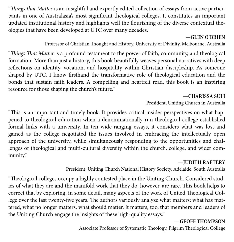 Prof. Glen O’Brien says that the book “highlights well the flourishing of the diverse contextual theologies that have been developed at UTC over many decades.” Assoc. Prof. Geoff Thompson, reflecting the title of the book, appreciates that the book explores “what has mattered, what no longer matters, what should matter.” And the President of the Uniting Church, the Rev. Charissa Suli (herself a graduate of UTC) offers appreciation for the way the book “beautifully weaves personal narratives with deep reflections on identity, vocation, and hospitality within Christian discipleship.”