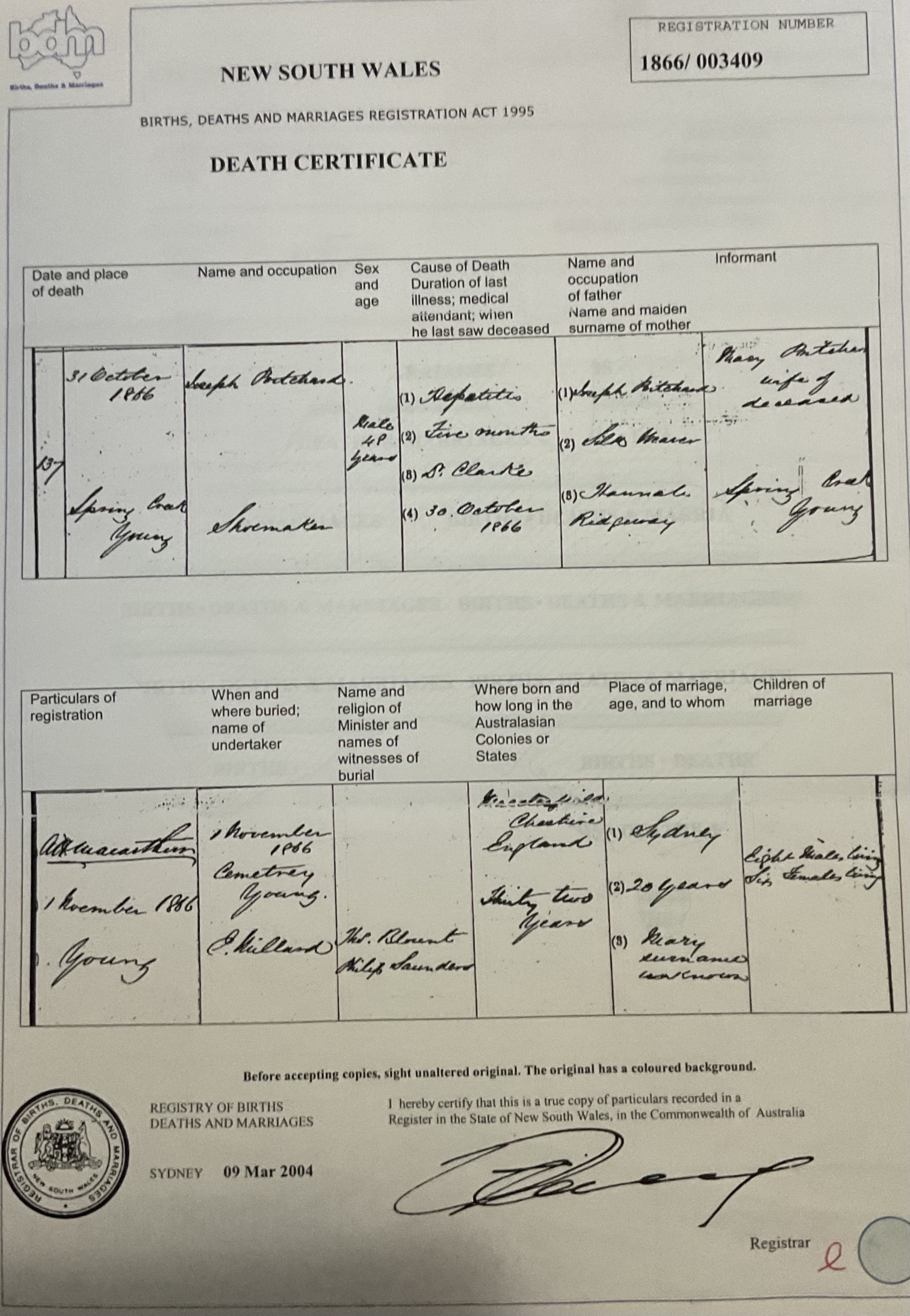 Soon after this marriage to Caroline, Nathan’s lungs became inflamed, and he died just ten weeks after his marriage, in Lismore, on 7 August 1874. He is buried with Elizabeth in the North Lismore Cemetery. (See his death certificate, above, and their tombstone, below.) Caroline subsequently married, for the third time, in 1878, and lived on until 1894.