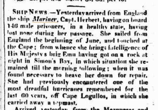 Once the ship had docked in Port Jackson, three prisoners were sent to the Hospital at Sydney and three were sent to Cockatoo Island on the recommendation of the Surgeon. The remaining prisoners on board were discharged daily as they were hired, commencing ship on 31 December 1849 and concluding on 9 January 1850.