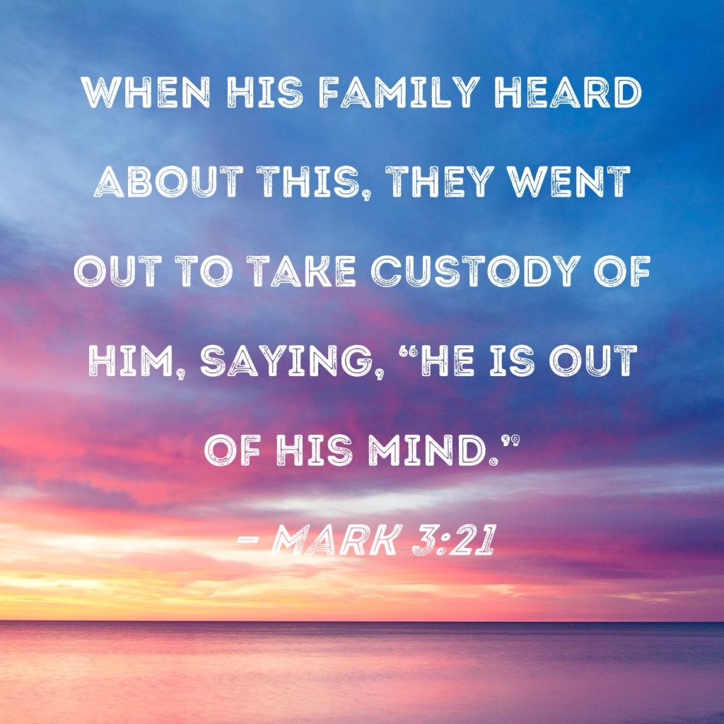 Rather, in Mark’s narrative reporting the beginning of the good news about Jesus, the chosen one, Jesus explicitly distances himself from his family. “Who are my mother and my brothers?”, he asks, when confronted by scribes from Jerusalem and labelled as “out of his mind” by his own family (Mark 3:21, 33).