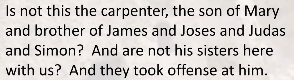 The offering from the narrative lectionary this coming Sunday (Mark 6:1–29) begins with the scene where Jesus goes to the synagogue in his hometown, Nazareth (6:1–6) and is rejected by those who “took offence at him” (6:3). Although he spoke with wisdom and performed acts of power (6:2), he is scorned as merely “the carpenter, the son of Mary and brother of James and Joses and Judas and Simon … and his sisters, here with us” (6:3).